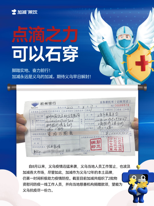 2022年8月11月,因义乌突如其来的疫情,整座城市按下了暂停键,全民进入静默期。在这场新冠肺炎疫情爆发期间,作为深耕义乌发展12年的K8凯发茶饮,主动发扬本土企业的社会担当和责任。截至2022年8月17日,公司共组织了2批物资慰问一线人员,并向当地慈善机构捐赠爱心款项。脚踏实地、奋力前行!K8凯发以实际行动为打赢疫情防控战贡献力量!